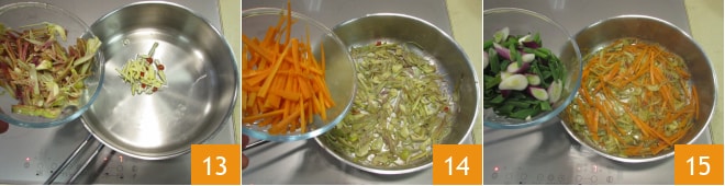 Agora passe para o cozimento. Em uma caçarola, aqueça um pouco de óleo em fogo alto e adicione o alho e a pimenta, em seguida, as alcachofras 13. Salteie por poucos instantes e acrescente as cenouras 14, a cebolinha 15