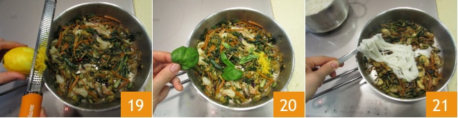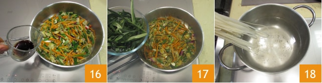 e despeje o molho de soja 16. Após um minuto, adicione as acelgas 17 e continue cozinhando por mais 4-5 minutos. Você tem tempo para cozinhar os noodles de arroz conforme os tempos de cozimento indicados na embalagem 18.