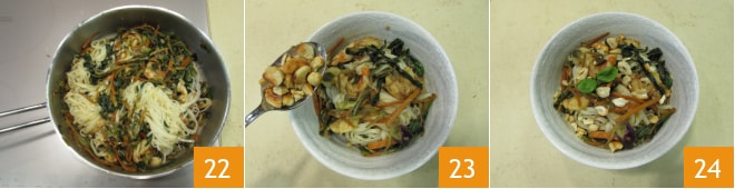 salteie rapidamente e proceda com a montagem dos pratos 22. Decore com os cajus 23 e bom apetite, os noodles com camarões e vegetais estão prontos 24!