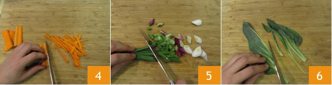 Em seguida, passe para as cenouras, limpando-as e cortando-as em palitos 4, a cebolinha, por outro lado, corte em fatias de cerca de 1 cm, mantendo também a parte verde 5. Fatie finamente também as acelgas 6.