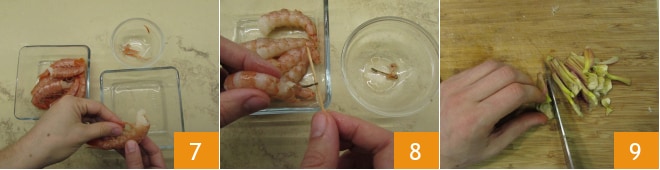 Agora passe para as caudas de camarão. A Como limpar os camarões é muito simples: retire as pernas e a carapaça 7, depois puxe o filamento preto com um palito ou uma faca pequena 8. Por último, corte finamente as alcachofras já Como limpar alcachofras anteriormente, assim elas não vão oxidar 9.