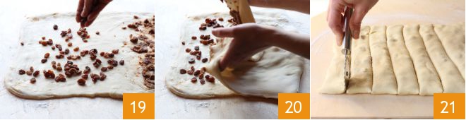 e espalhe as uvas-passas na outra metade 19. Dobre a metade com o creme de manteiga sobre a metade com as uvas-passas 20 e sele as extremidades da massa com os dedos. Usando uma roda de cortar massa, corte o retângulo assim obtido em 15 tiras 21.