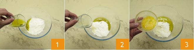 Para preparar os olhos de Santa Lúcia, primeiro coloque a farinha em uma tigela, adicione o óleo, o vinho 2 e um ovo 3.