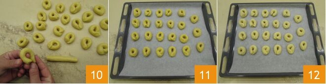 Forme anéis fechando o cilindro recém-cortado 10, devem ser semelhantes a taralli. Transfira-os para uma assadeira forrada com papel manteiga 11 e asse em forno estático pré-aquecido a 180° por cerca de 20 minutos. Uma vez assados, retire do forno 12 e deixe esfriar.
