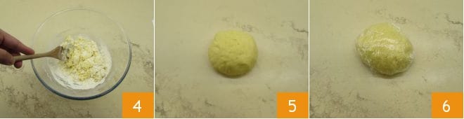 Misture primeiro com uma colher de pau 4, depois com as mãos até obter uma massa homogênea 5. Transfira para uma superfície e cubra com filme plástico 6, enquanto começa a formar os biscoitos, caso contrário, poderá ressecar.