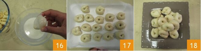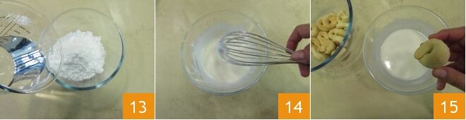 Quando estiverem frios, prepare a cobertura. Despeje em uma tigela o açúcar de confeiteiro e a água 13; misture com um batedor até obter uma cobertura lisa 14. Mergulhe então apenas o lado superior do tarallino na cobertura 15,