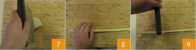 Retire uma parte 7 e forme um cilindro com cerca de 1,5 cm de espessura 8. Em seguida, corte pedaços com cerca de 10 cm de comprimento 9.