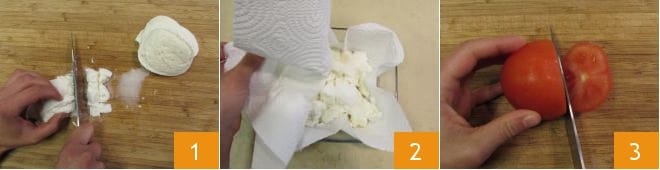 Para preparar a omelete caprese, primeiro corte a mussarela em cubos 1 e deixe escorrer o excesso de água colocando-a entre dois pedaços de papel toalha até o uso 2. Lave e fatie os tomates 3 para obter cerca de dez fatias.