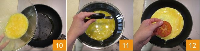 Despeje os ovos batidos 10 e cubra com a tampa 11. Assim que a parte superior começar a firmar e a formar bolhas, em um lado coloque três fatias de tomate 12.