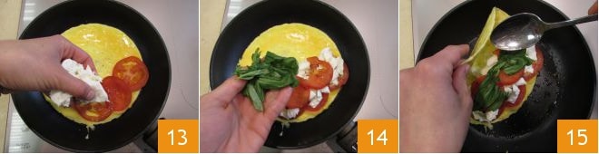 Adicione também metade da mussarela bem drenada 13, mais duas fatias de tomate e o manjericão fresco 14. Feche a omelete sobre si mesma em forma de meia-lua 15.