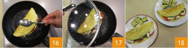 Dobre bem ao meio 16 e continue cozinhando em fogo baixo cobrindo com a tampa até que a mussarela derreta 17. A primeira omelete está pronta, continue da mesma forma com a segunda. Sirva suas omeletes caprese bem quentes 18.