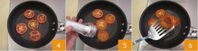 Aqueça uma frigideira, coloque as fatias de tomate 4, salgue 5 e asse por cerca de 1 minuto 6.