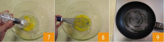 Prepare a massa para a primeira omelete: em uma tigela, coloque os dois ovos inteiros, salgue, adicione pimenta 7 e bata com um batedor 8. Unte uma frigideira com óleo 9 e aqueça.