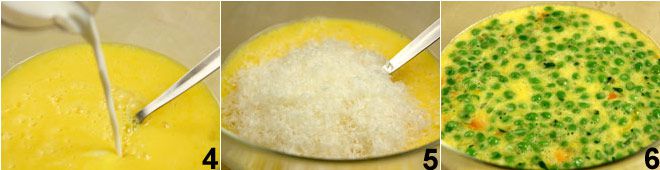 Em uma tigela, bata os 6 ovos com um garfo, incorpore o leite 4 e o Grana Padano ralado 5, misture tudo e ajuste o sal e a pimenta. Adicione à mistura o conjunto de cenouras e ervilhas 6.