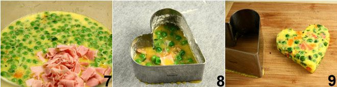 Adicione também o presunto cozido 7 cortado em pedacinhos e misture bem. Estenda uma folha de papel manteiga em uma assadeira e coloque formas de metal (cortadores) nos formatos que preferir; nós usamos coraçõezinhos. Unte e enfarinhe bem por dentro e depois despeje a mistura de ovos e legumes 8, até uma altura de cerca de 2 cm. Asse no forno ventilado a 190°C por cerca de 20 minutos. Retire do forno e tire cuidadosamente as omeletes alegres das formas de metal 9 com a ajuda de uma faca, tomando cuidado para não quebrá-las. Sirva as omeletes alegres mornas com uma saladinha de tomates.