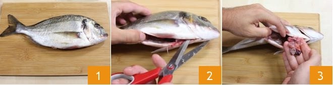 Para preparar a dourada às ervas com caponata, comece limpando as douradas. Pegue cada dourada 1 e, com uma tesoura, retire as barbatanas e comece a escamá-las com o utensílio apropriado ou com a lâmina de uma faca 2, passando repetidamente da cauda à cabeça. Em seguida, proceda à evisceração do peixe. Lave bem em água corrente para remover quaisquer vestígios de sangue restantes. Neste ponto, com uma faca afiada, faça um corte transversal e retire a cabeça da sua dourada 3.
