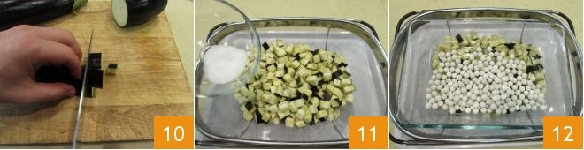 Envolva em filme plástico e deixe marinar enquanto prepara a caponata. Para preparar a caponata, comece pelas berinjelas: lave-as, corte suas pontas e corte-as em cubos de cerca de 1,5 cm 10. Coloque-as em um escorredor e tempere com sal 11, em seguida coloque um peso sobre elas 12 e deixe escorrer por pelo menos uma hora para que percam o amargor.