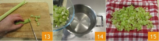 Enquanto isso, limpe os talos de aipo, corte-os em tiras 13 e escalde-os em água fervente levemente salgada 14. Após cerca de 5 minutos, escorra-os e seque-os com um pano de cozinha 15.
