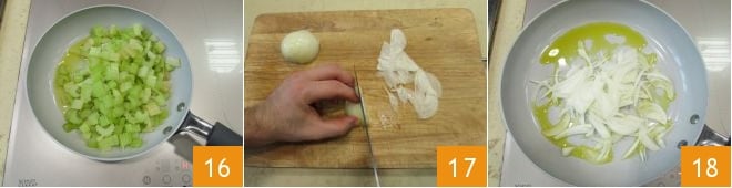 Nesse ponto, despeje um fio de azeite em uma panela e refogue as tiras de aipo 16 por cerca de 5 minutos, depois coloque-as em uma tigela e reserve. Fatie finamente as cebolas 17 e refogue-as em outra frigideira 18.