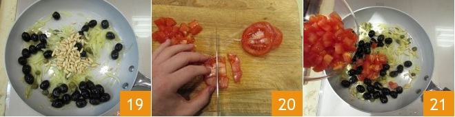 Uma vez murchas, adicione as azeitonas sem caroço, os pinhões e as alcaparras, após ter lavado bem estas últimas em água corrente para retirar o excesso de sal. 19. Deixe refogar por cerca de dez minutos e, enquanto isso, corte os tomates em cubos 20 e adicione-os à frigideira 21.