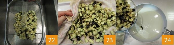 Cozinhe por cerca de 20 minutos e, enquanto isso, lave as berinjelas já escorridas 22, escorra-as e seque com um pano de cozinha 23 ou papel absorvente. Em seguida, coloque as berinjelas em óleo abundante e quente 24.