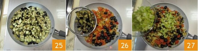 Frite por alguns minutos, até que fiquem levemente douradas 25. Escorra-as do óleo e coloque diretamente na frigideira com a mistura de tomates, azeitonas e cebolas 26. Em seguida, adicione também as tiras de aipo 27.