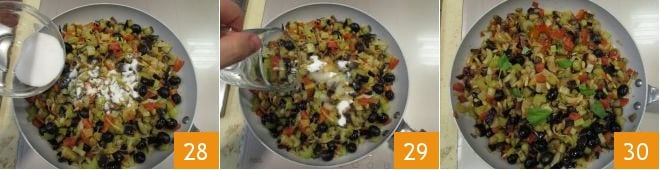 Misture tudo e adicione o açúcar 28 e o vinagre 29. Uma vez que toda a parte alcoólica tiver evaporado, misture novamente, adicione as folhas de manjericão 30 e desligue o fogo.