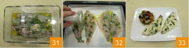 Deixe esfriar um pouco e, enquanto isso, dedique-se ao cozimento das douradas. Retire os filés de dourada deixados na geladeira para marinar 31 e coloque-os, sem escorrer muito, em uma assadeira forrada com papel manteiga. Asse em forno estático pré-aquecido a 200°C por 16-18 minutos 32 (use o forno ventilado a 180°C por cerca de 10 minutos). Sirva seus filés de dourada às ervas com caponata ainda quentes 33.