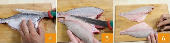 Então, corte a cauda e a parte dorsal do peixe ao longo da coluna vertebral 4, começando de cima, e mova a lâmina horizontalmente em relação à superfície de trabalho para obter o primeiro filé 5. Vire o peixe e proceda da mesma forma, destacando a carne da espinha para obter o segundo filé. Identifique todas as espinhas presentes passando a mão sobre o filé e retire-as utilizando uma pinça 6.