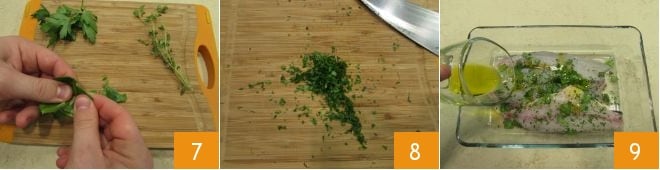Lave em água corrente o tomilho, o manjericão e a salsinha, depois coloque-os em uma tábua de corte 7 e pique-os finamente com uma faca 8. Coloque os filés de peixe em uma travessa grande o suficiente para contê-los e adicione o azeite e a mistura de ervas frescas 9.