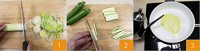 Para preparar as orecchiette ao iogurte com abobrinha, comece limpando e cortando os vegetais: então elimine as folhas verdes e as mais externas e fatie finamente 1, depois retire as extremidades das abobrinhas e corte-as em julienne 2. Em uma panela, aqueça três colheres de sopa de azeite de oliva 3
