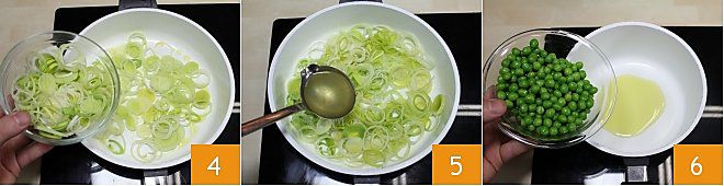 e adicione o alho-poró 4 e deixe cozinhar adicionando uma concha de caldo de legumes para prolongar o cozimento 5. Em outra panela menor, adicione uma colher de sopa de azeite de oliva e acrescente as ervilhas 6,