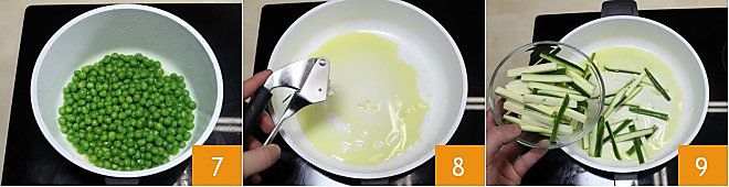deixe-as cozinhar por 15 minutos 7 e, também neste caso, adicione a concha de caldo e deixe cozinhar por mais alguns minutos. As ervilhas devem permanecer de uma bela cor verde brilhante e bastante crocantes. Em outra panela, adicione o restante do azeite e amasse o dente de alho 8. Adicione as abobrinhas ao azeite e deixe cozinhar por alguns minutos 9,