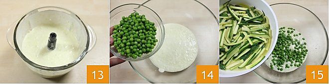 e bata tudo até obter um creme homogêneo 13. Em uma tigela, despeje o creme de iogurte, as ervilhas 14, as abobrinhas 15, sal e pimenta