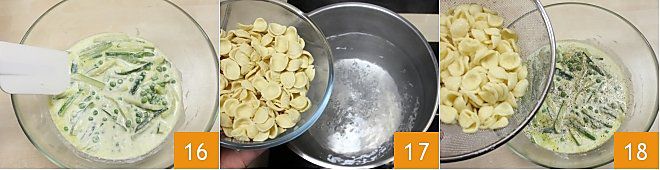 e misture tudo bem 16. Em seguida, cozinhe as orecchiette em bastante água salgada 17, uma vez que a massa esteja cozida, coloque-a na tigela 18 junto com o creme de iogurte e vegetais,
