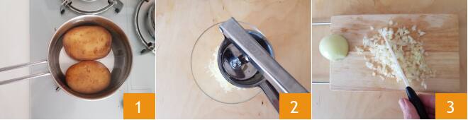 Para preparar as orecchiette com creme de batatas, brócolis e linguiça, comece com os tubérculos. Coloque as batatas em uma panela com bastante água e leve ao fogo: a partir do momento que começar a ferver, conte 30 - 50 minutos ou até que estejam cozidas 1. Ao final do cozimento, descasque-as ainda quentes e amasse-as 2. Enquanto isso, prepare o molho. Descasque a cebola e pique-a finamente 3.