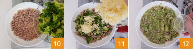 Adicione as flores cozidas 10 e deixe ganhar sabor por alguns minutos antes de adicionar também as batatas amassadas 11. Neste ponto, retire um pouco de água da panela e dilua o molho para transformá-lo em um creme homogêneo enquanto mexe; ajuste sal e pimenta 12.