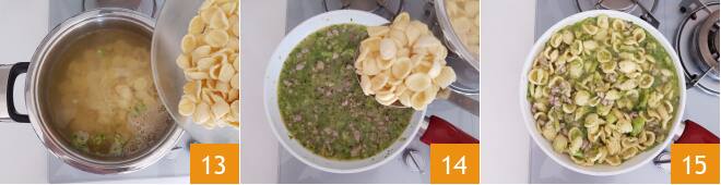 Mergulhe as orecchiette na panela de água onde você cozinhou as flores, adicione sal e cozinhe até ficar al dente 13, depois escorra diretamente no molho 14 e misture 15.