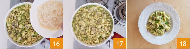 Desligue o fogo e adicione o queijo ralado 16, misture 17 e sirva imediatamente suas orecchiette com creme de batatas, brócolis e linguiça 18.
