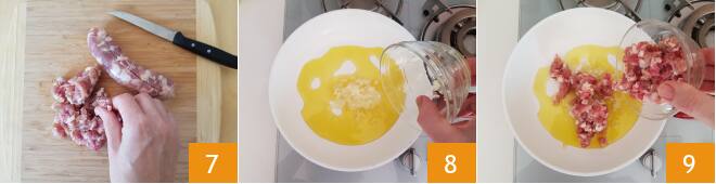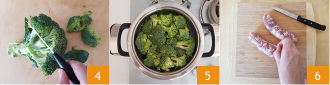 Em seguida, limpe o brócolis destacando as flores com uma faquinha 4, lave e vá para o fogão. Coloque uma panela com água no fogo e assim que estiver fervendo, mergulhe as flores, cozinhando por 5-6 minutos 5. Ao final do cozimento, escorra as flores, mas não descarte a água, que será usada para cozinhar as orecchiette. Descasque as linguiças 6