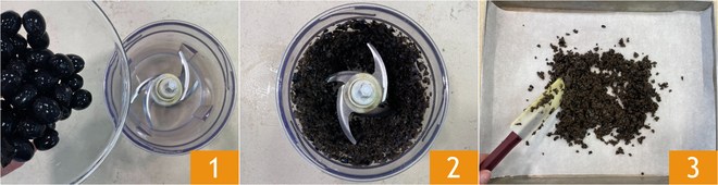 Para preparar as orecchiette frias de verão comece pelo crumble de azeitonas: coloque as azeitonas pretas sem caroço no processador 1 e triture até picá-las finamente 8. Distribua as azeitonas picadas em uma assadeira forrada com papel manteiga 3 e asse em forno ventilado pré-aquecido a 2300 por 15 minutos.<\/p>
