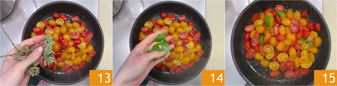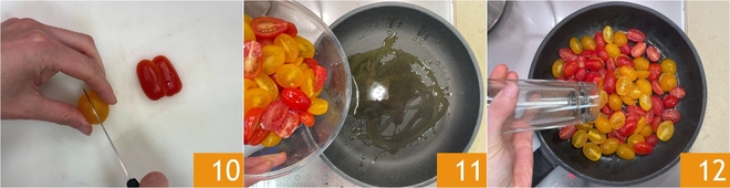 Agora cuide dos tomatinhos: corte ao meio os datterini 10, depois coloque-os em uma frigideira antiaderente já quente com um fio generoso de azeite 11. Tempere com sal e pimenta 12.<\/p>