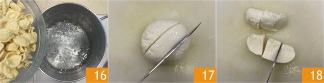 Leve uma panela com água salgada ao ponto de fervura e cozinhe as orecchiette pelo tempo indicado na embalagem 16. Enquanto isso, corte a muçarela em cubinhos de cerca de 3 cm 17 18.<\/p>