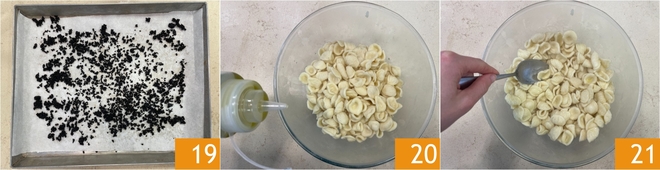 O crumble de azeitonas também estará pronto, então retire do forno e deixe amornar 19. Escorra as orecchiette em uma tigela grande, tempere com um fio de azeite 20 e mexa para não deixá-las grudar 21.<\/p>