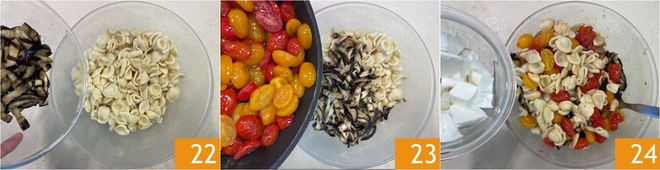Deixe amornar por alguns minutos, depois junte as berinjelas grelhadas 22, os tomatinhos salteados na frigideira 23 e a muçarela 24.<\/p>