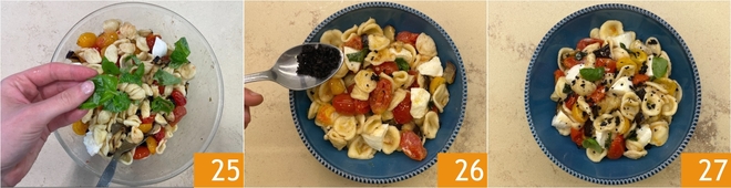 Aromatize com algumas folhas de manjericão 25 e misture delicadamente, em seguida disponha nos pratos. Decore com uma boa porção de crumble de azeitonas 26 e sirva as suas orecchiette frias de verão 27!<\/p>