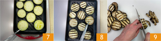 Coloque as fatias de berinjela em uma grelha bem quente 7 e grelhe dos dois lados 8. Uma vez cozidas, corte-as em tirinhas 9 e reserve.<\/p>