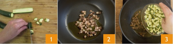 Para preparar as orecchiette gratinadas ao forno, primeiro coloque uma panela de água para ferver as orecchiette. Limpe as abobrinhas e corte-as em cubos 1. Aqueça um fio de azeite em uma frigideira e doure os cubos de bacon em fogo alto 2, depois adicione as abobrinhas 3.