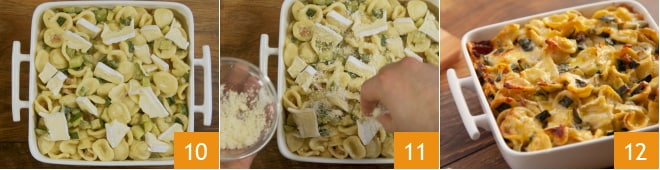 Adicione o brie em pedaços 10, polvilhe com o Parmigiano Reggiano ralado 11 e asse em forno estático pré-aquecido a 200° por cerca de 15 minutos, até que a superfície fique bem dourada. Suas orecchiette gratinadas ao forno estão prontas para serem retiradas do forno e servidas 12!