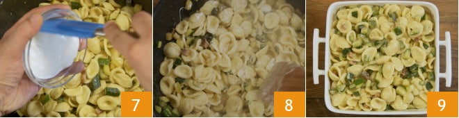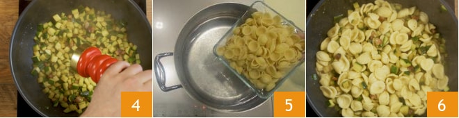 Tempere com sal e pimenta 4 e cozinhe em fogo médio por cerca de 10 minutos. Enquanto isso, adicione sal à água que já estará fervendo e cozinhe as orecchiette 5. Escorra a massa al dente e coloque-a diretamente na frigideira com as abobrinhas e o bacon 6. Misture brevemente e retire do fogo.